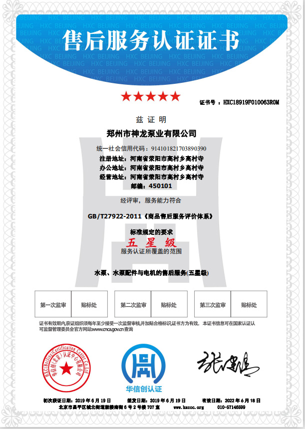 祝賀鄭州市神龍泵業(yè)有限公司獲得水泵、水泵配件與電機(jī)的五星級(jí)售后服務(wù)認(rèn)證。