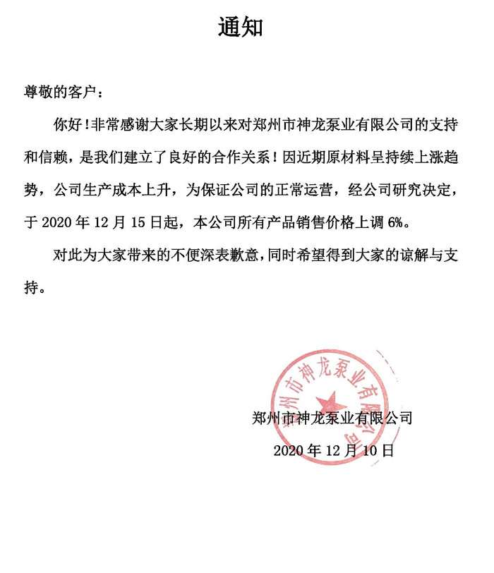 本公司所有產品于2020年12月15日起銷售價格上調6%